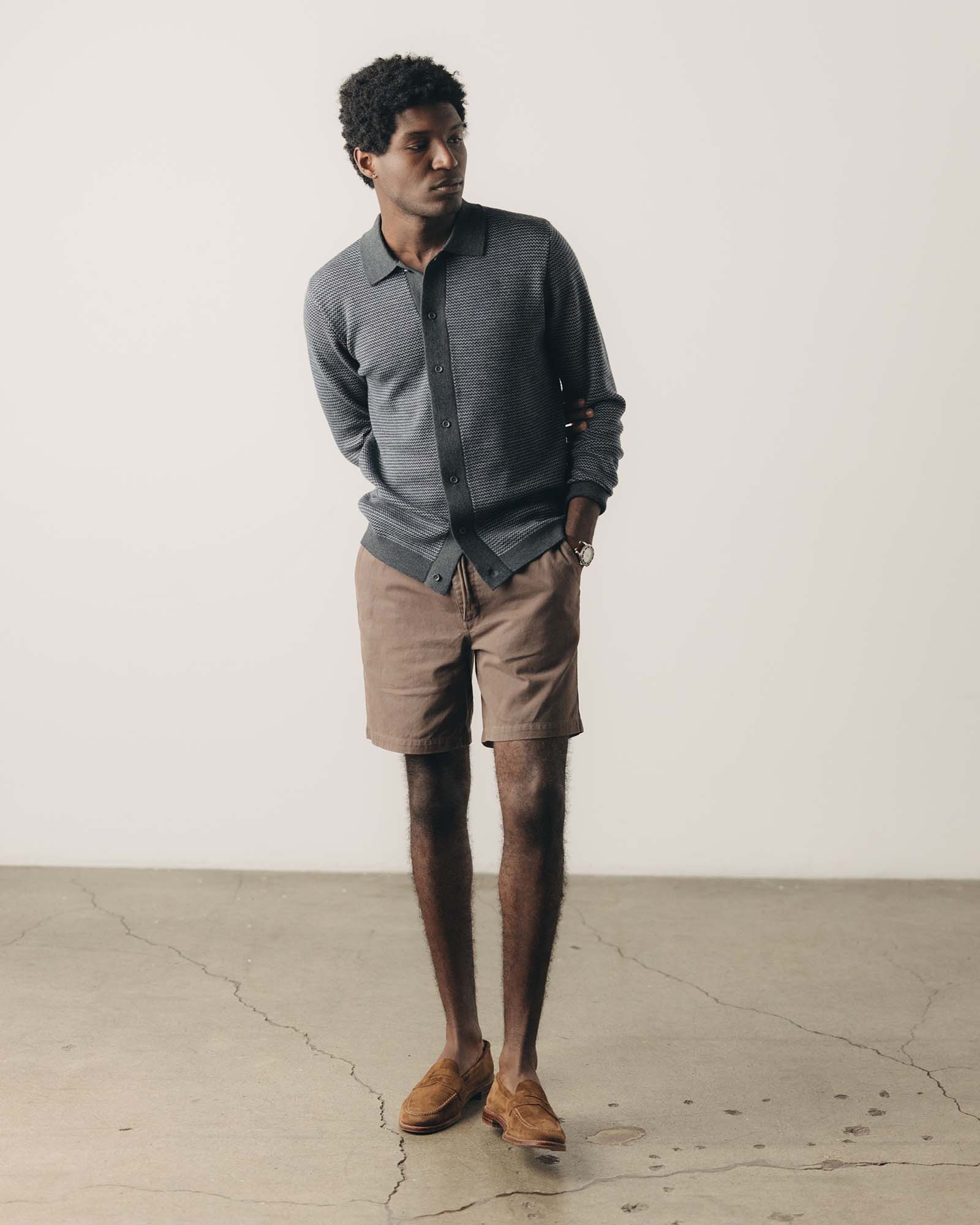 - Full milano rib knit on collar and front placket.